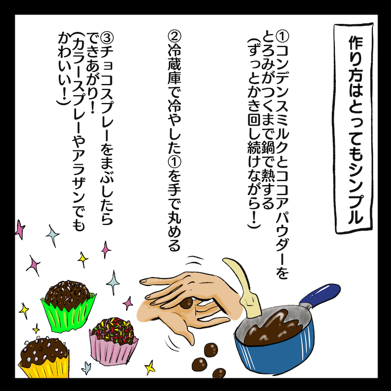 ③冷ましたものを手で丸めて、チョコスプレーをまぶしたら出来上がり!